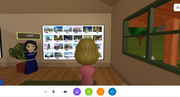 オープン空間には、営業時間内は当社担当者のアバターが在席しており(※2)、お客様は当社が現在取り扱っている物件の情報収集、動画視聴、担当者とのアバターを介した音声会話・チャット等で一般的な住まいに関する疑問点を解消いただくことが可能です。