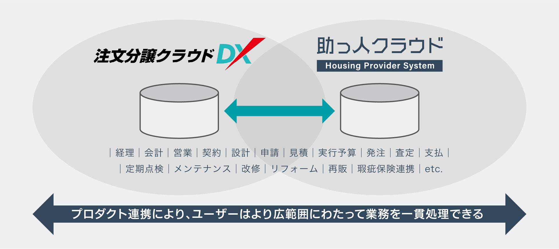 注文分譲クラウドDX及び助っ人クラウドは両者とも住宅事業者をユーザーとする住宅事業基幹クラウドシステムですが、付加価値向上のためこの度プロダクト連携を開始することとなりました。