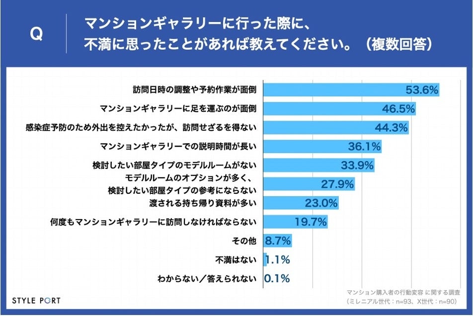 また、スタイルポートが実施した、マンション購入者の行動変容に関するミレニアル世代とX世代への調査(※3)の結果、マンションギャラリーにはほとんど(約91%)が訪問するものの、その多くが「足を運ぶのが面倒」「訪問日時の調整が面倒」「感染症予防のために外出を控えたかったが訪問せざるを得ない」など、従来のマンションギャラリーのあり方に対し、不満を持っていることが明らかになりました。
