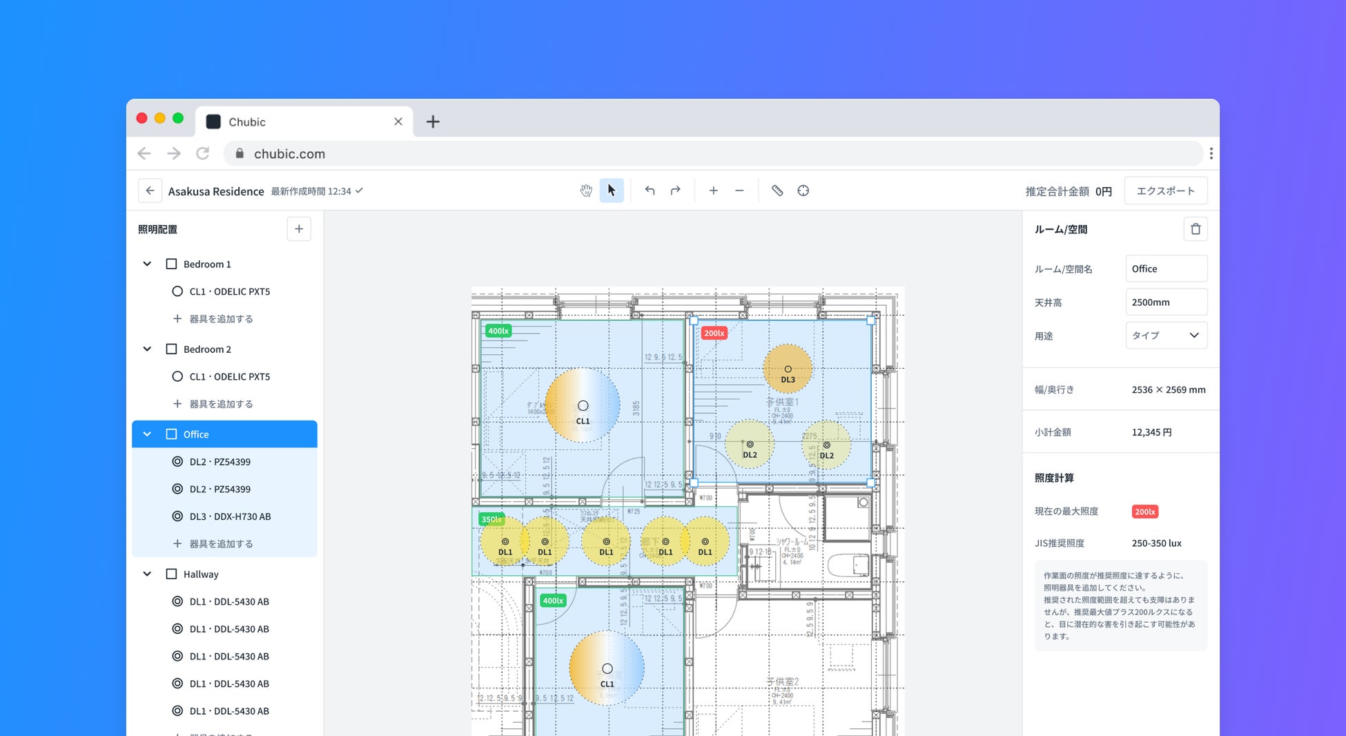 そこで、インターネットを介して誰でも、どこからでも「照度計算」や「照明配置図」が数分で作成できる『CHUBIC』(β版)を開発しました。