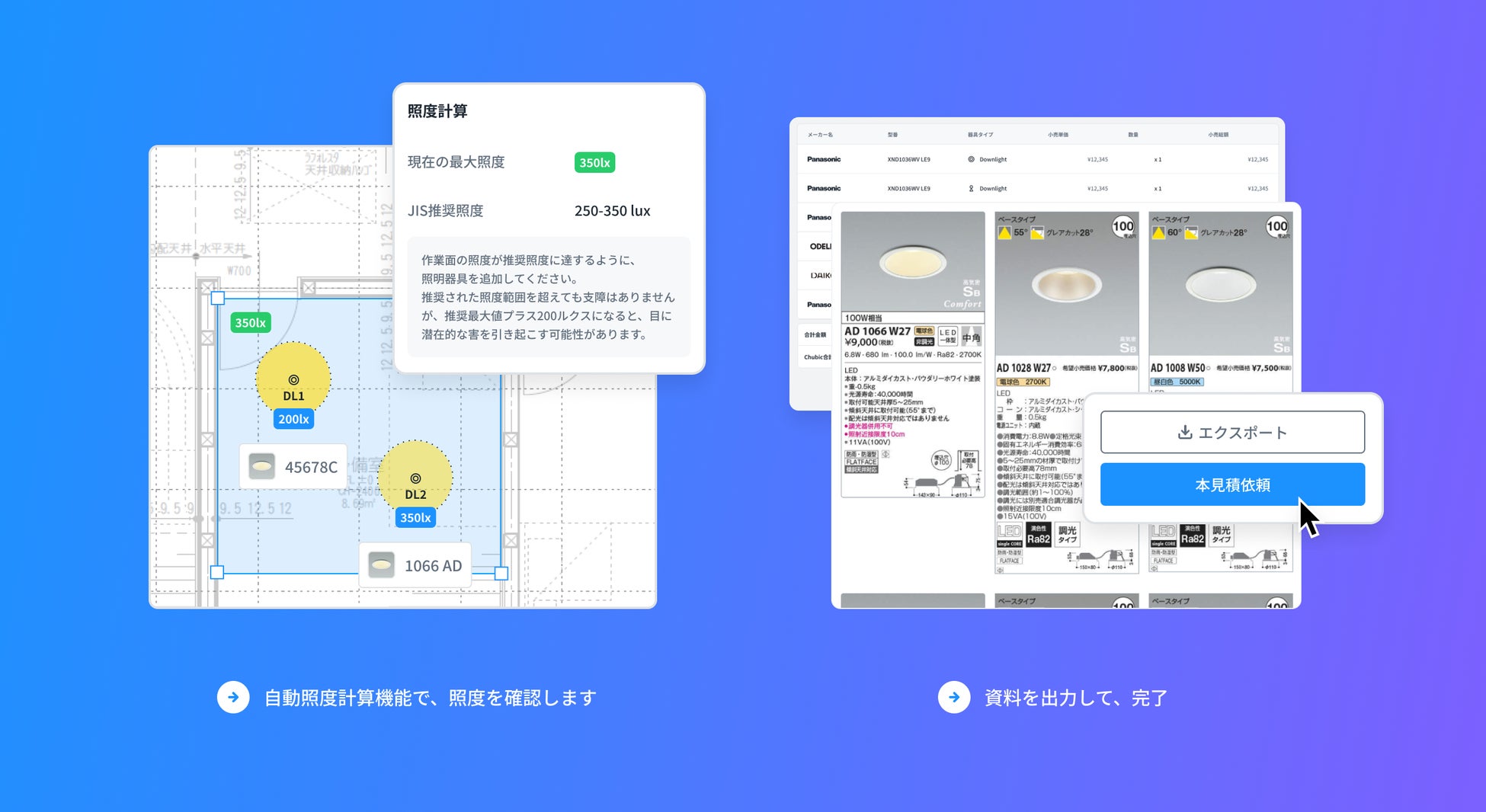 照度計算書の問い合わせ、見積もり、照明プランなどの各種書類作成の手間をかけることなく、簡単に照明プランニングに必要な資料をワンストップで制作することができます。