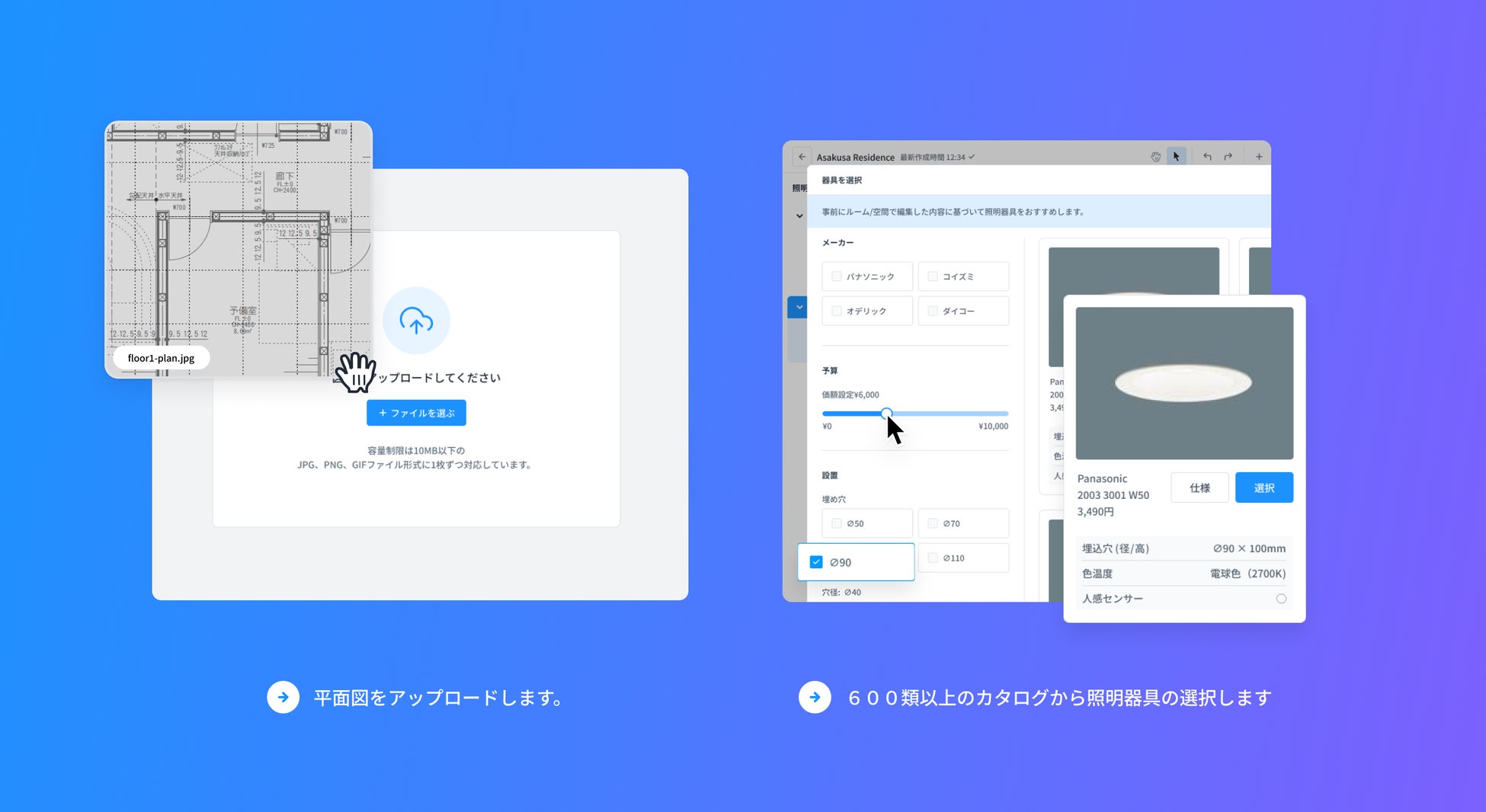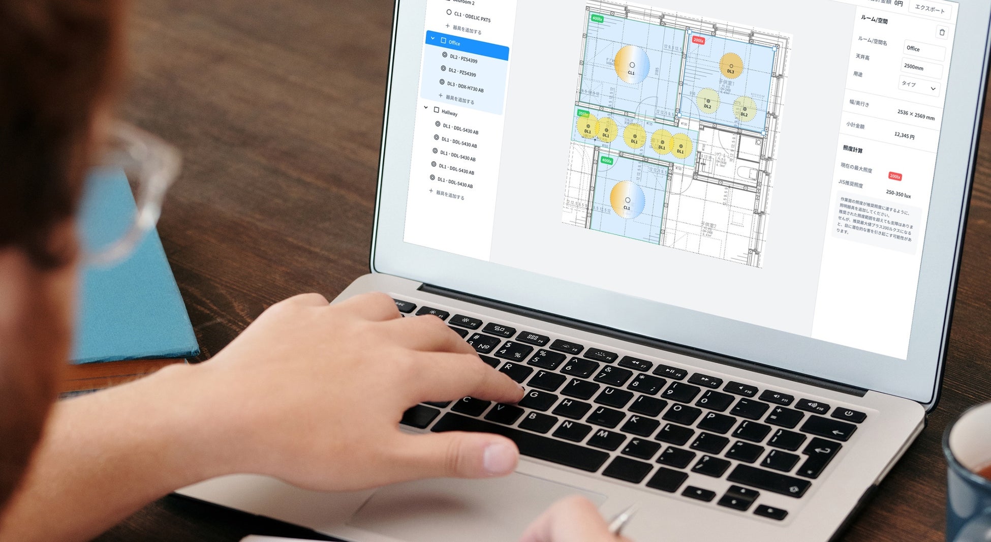 平面図をアップロードして照明器具を選ぶだけで、照度が自動的に計算され、必要な灯数が推奨されます。