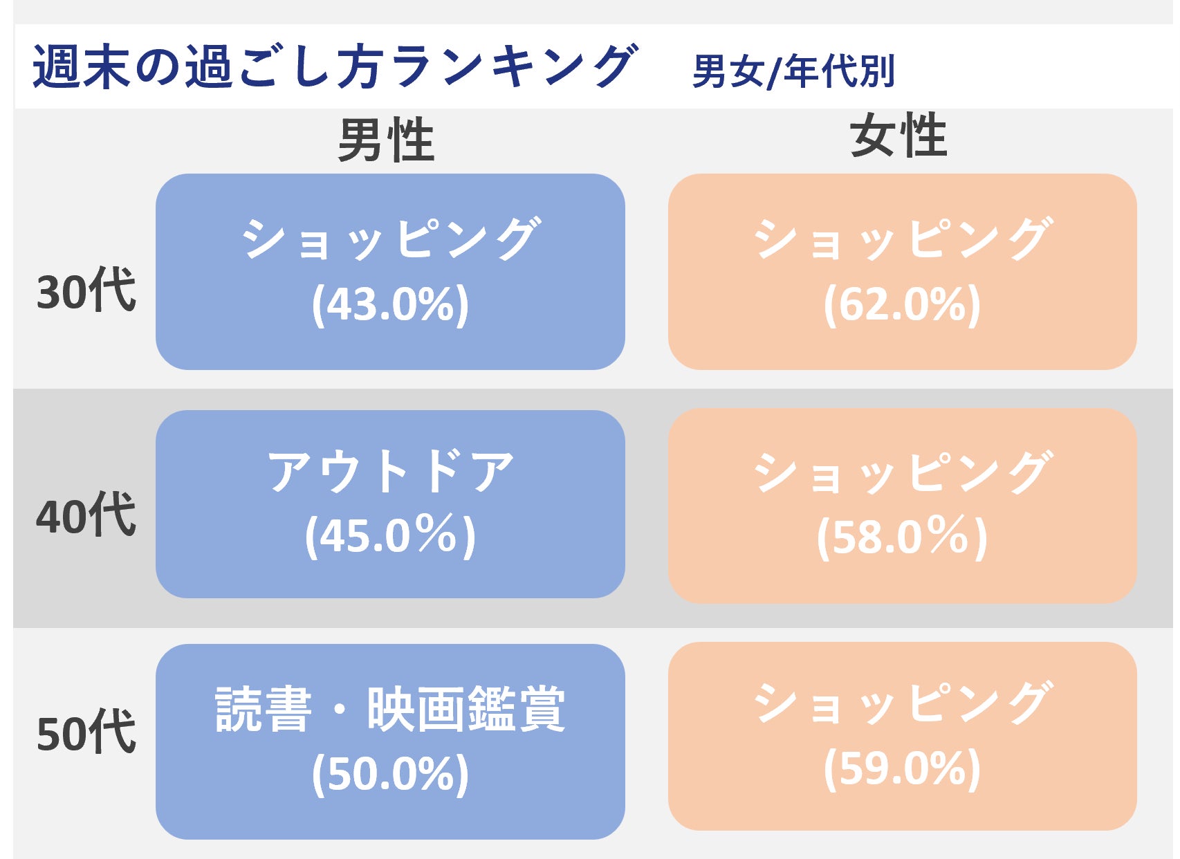 休日の過ごし方は、総合的に「ショッピング」が最も多かったものの、男女年代別に見てみると40代男性はハイキング、登山、マリンスポーツなどアウトドアを楽しんでいる方が多いことが分かりました(45.0%)。