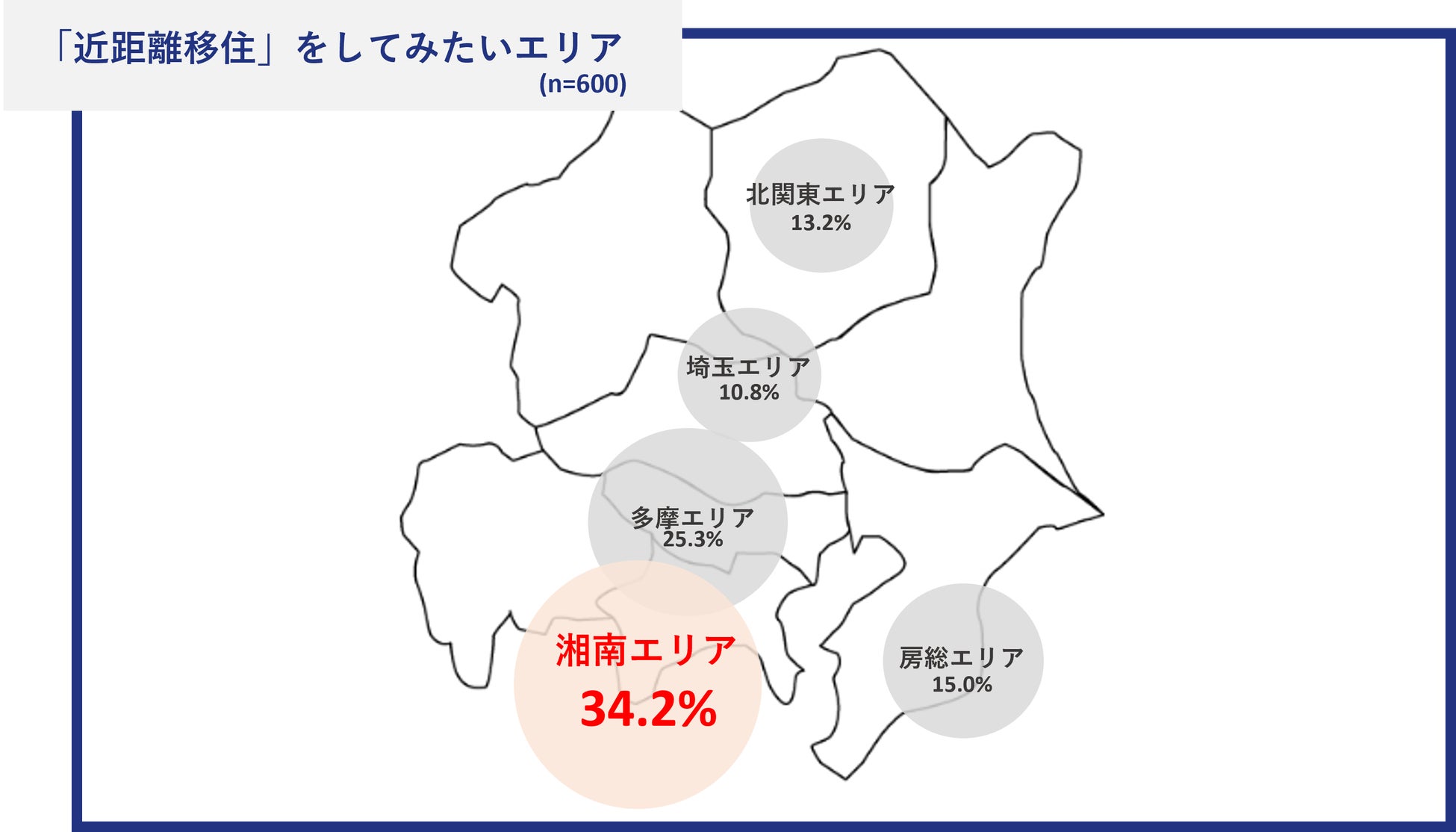 「近距離移住」をする場合の都心からの移動時間について、「電車で1時間以内」を理想とする声が最も多く (47.8%)、なるべく都心へのアクセスが良い立地が求められている傾向にありました。その中でも、関東近郊で近距離移住として人気のエリアは「湘南エリア(34.2%)」となりました。