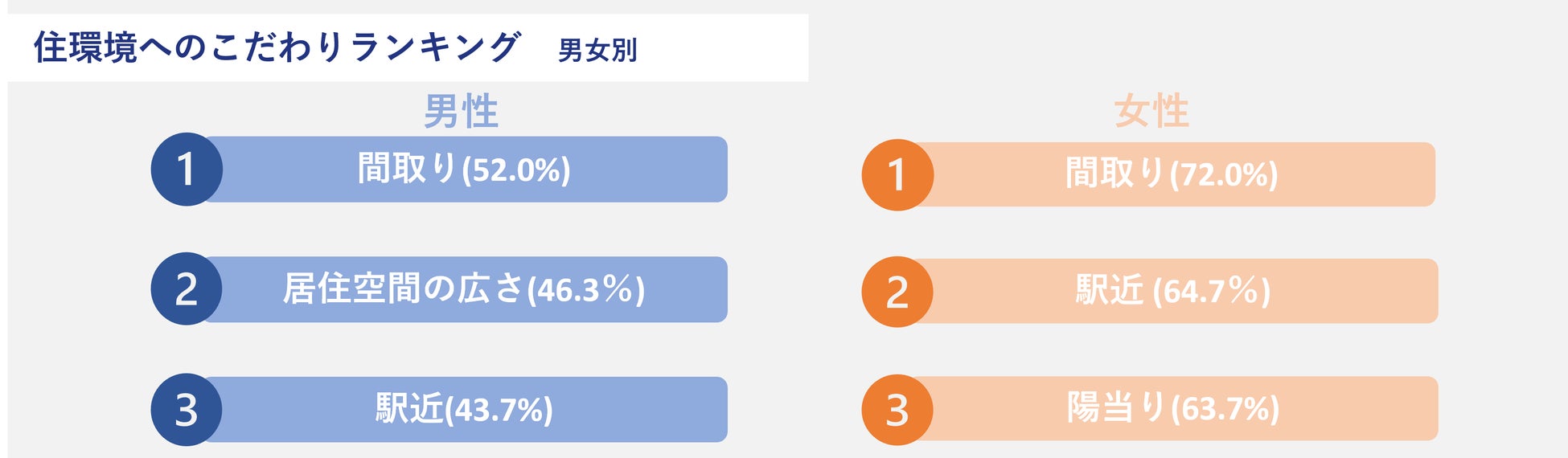 普段住まいを探す際のこだわりについて、男性は「間取り(52.0%)」「居住空間の広さ(46.3%)」「駅近(43.7%)」である一方、女性は「間取り(72.0%)」「駅近(64.7%)」「陽当たり(63.0%)」となりました。男女でポイント数に差はあるものの、「間取り」と「駅近」についてはともに重要視されていることが分かりました。