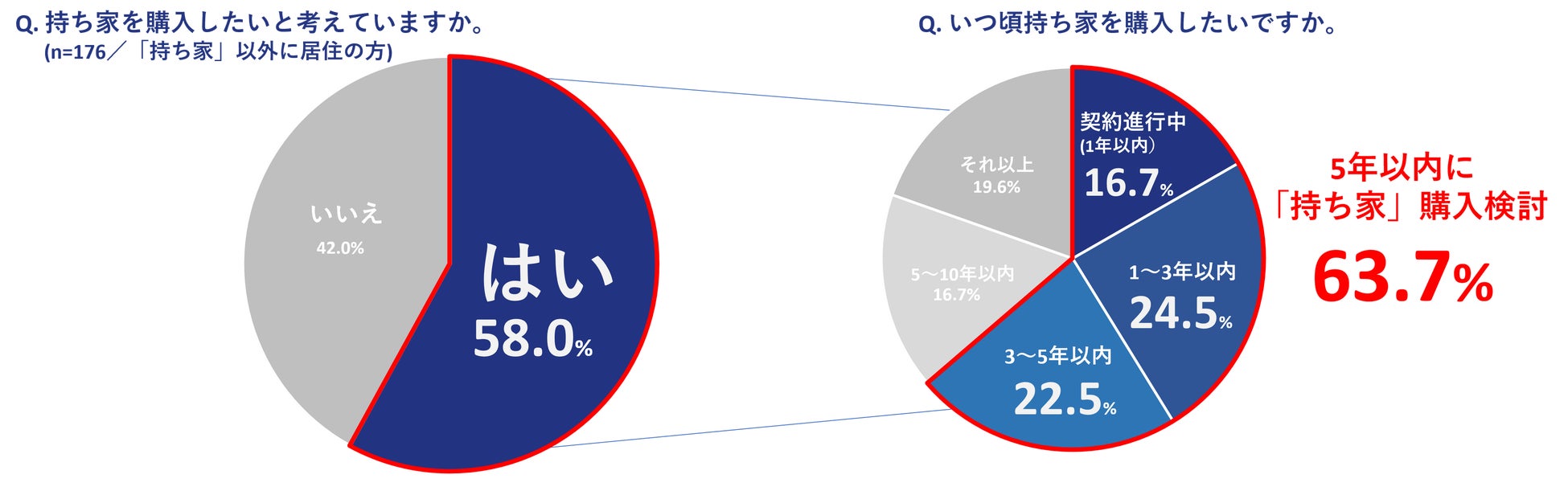 現在賃貸住宅や社宅等に居住している人に将来持ち家を購入したいか聞いたところ(n=176)、58.0%が「はい」と回答。その中で購入を検討したい時期について伺うと、「5年以内」と回答した人が63.7%と半数以上を占める結果となりました。すでに「契約を進めている人(1年以内)」は16.7%、「1年~3年以内」は24.5%と、「3年以内」と考えている人は4割(41.2%)おり、現実的に購入を検討している人が多い傾向にありました。