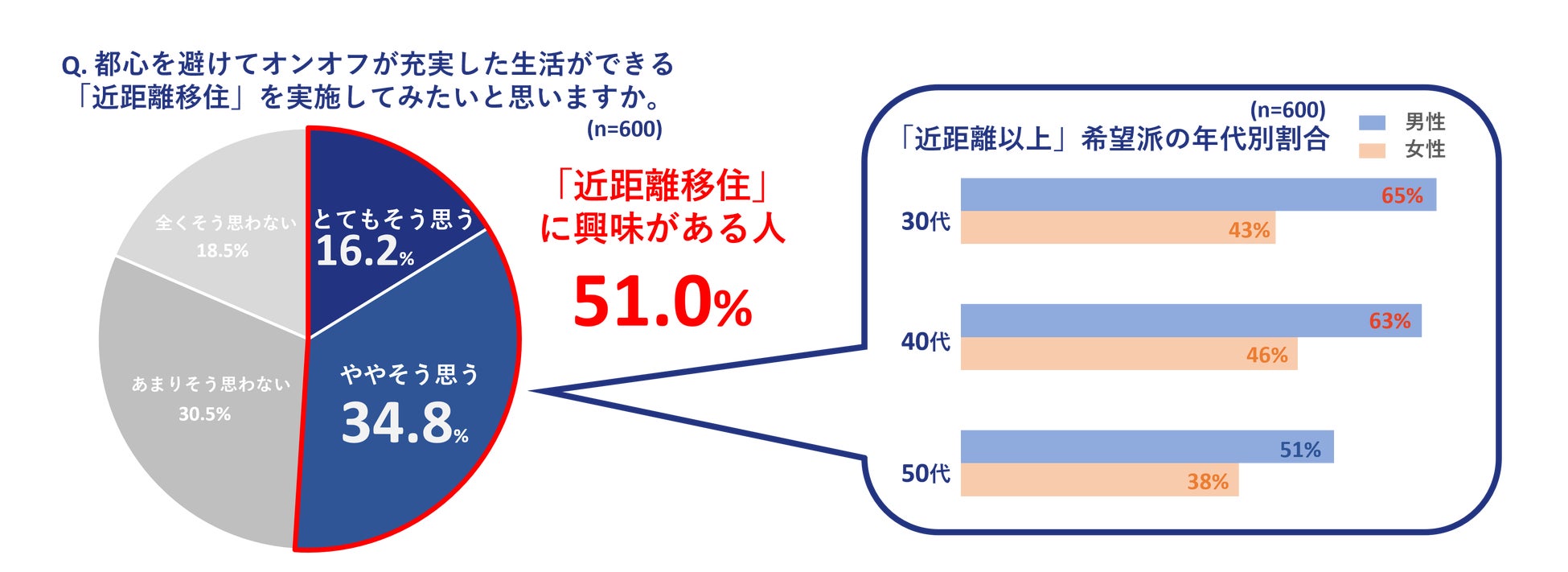 オンオフが充実した生活を実現するための「近距離移住」という考え方について、実現したいと考えている人は51.0%と半数以上にのぼることが分かりました。特に、30代男性(65.0%)と40代男性(63.0%)はその傾向が強く、仕事をプライベートな居住空間から区別することでオンオフの切り替えを促す「近距離移住」に興味を示していることが伺えます。