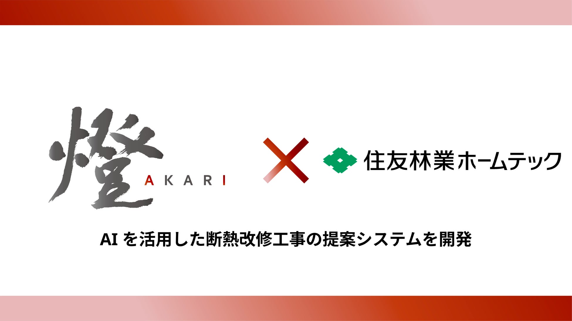 燈株式会社(社長:野呂侑希 本社:東京都文京区)は、住友林業ホームテック株式会社(社長:島原卓視 本社:東京都千代田区)に対して、AI技術を含むアルゴリズム開発とAIシステム開発を行いました。今回のAIをベースに開発された「効率的な調査によるAIを活用した断熱改修工事提案システム」は、12月21日に東京・名古屋・大阪エリアから利用を開始して全国の省エネ基準地域区分5~7地域を対象に展開していきます。
