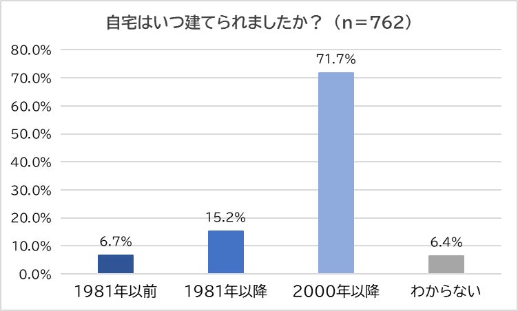 日本の住まいには、建築基準法で定められた耐震基準があり、1981年6月以前の「旧耐震基準」と1981年6月以降の「新耐震基準」、2000年6月以降の「2000年基準」の大きく3つの時期に分類されています。そこで、「木造」と回答した762人に「自宅はいつ建てられたか?」尋ねたところ、圧倒的に「2000年以降」(71.7%)が多く、「1981年以降」(15.2%)、「1981年以前」(6.7%)や「わからない」(6.4%)は僅かでした。