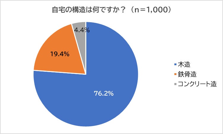 「自宅の構造は何か?」尋ねたところ、「木造」(76.2%)、「鉄骨造」(19.4%)、「コンクリート造」(4.4%)となりました。