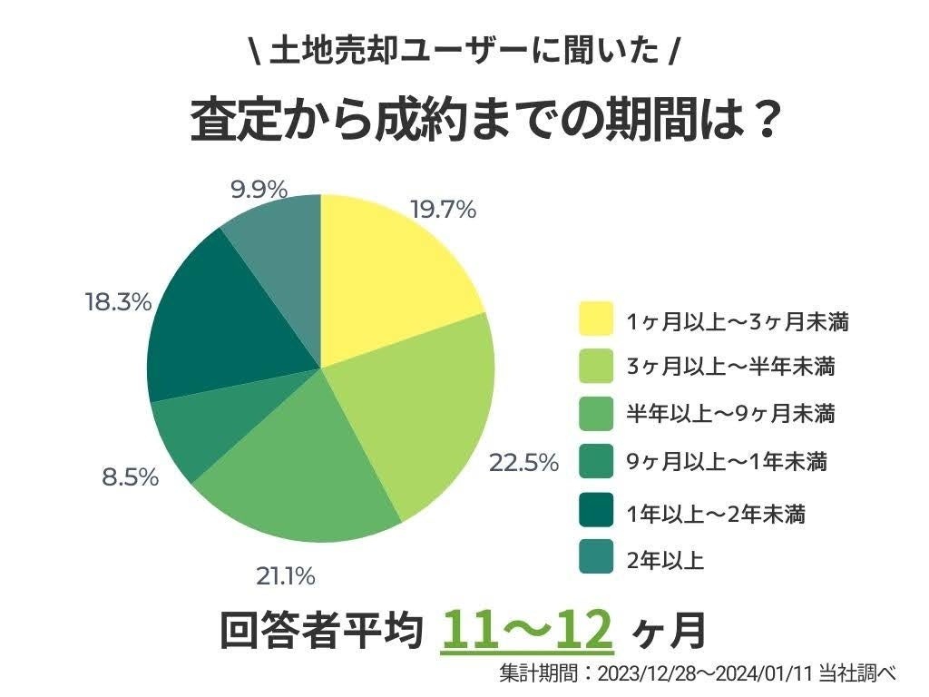 また、査定から成約までにかかった期間は3ヶ月〜半年未満(16人)、9ヶ月以上〜1年未満(16人)が最多で、回答者の平均は11〜12ヶ月でした。
