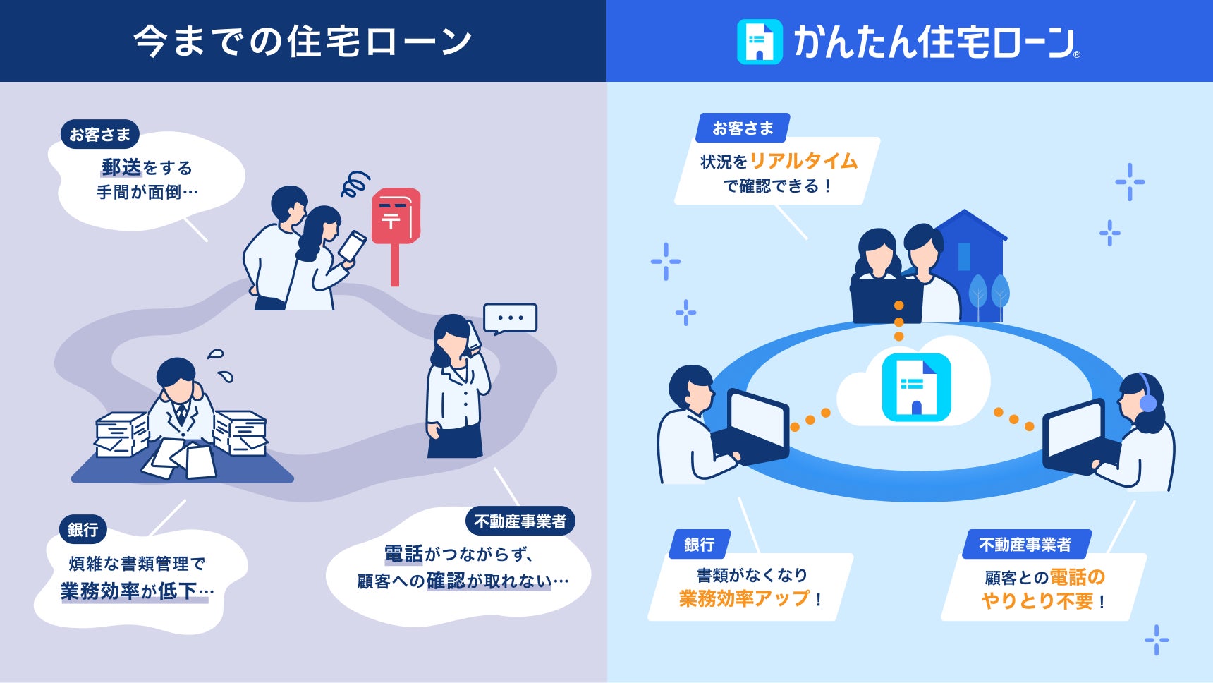 従来の住宅ローンは、お申込み書類の記入や郵送・審査状況の確認のための電話でのやりとりなど煩雑なお手続きが必要で、お客さまおよび不動産事業者にとって非常に負荷の大きなものでした。