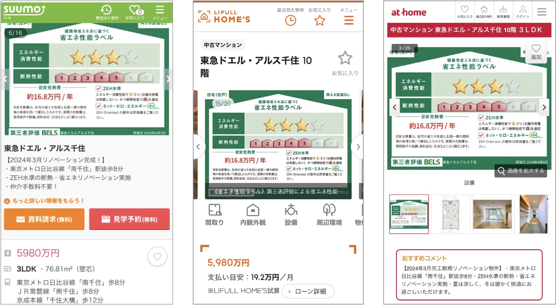 「省エネ性能ラベル」の発行・表示1号案件として、東京都荒川区のリノベーション済みマンションの販売を2024年4月から開始。これは、両社の協業により、省エネ性能を向上させ、BELS認証「ZEH Oriented」を取得した「ZEH水準リノベーションマンション」です。