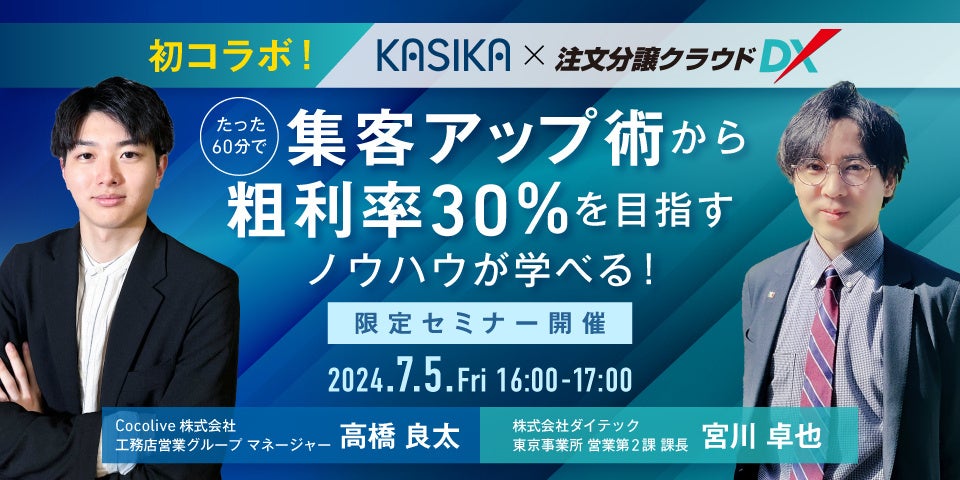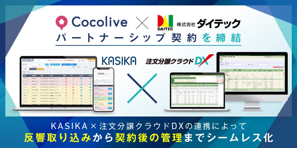 ダイテックとCocoliveは、ダイテックの基幹システム「注文分譲クラウドDX」及びCocoliveの自動追客・商談管理ツール「KASIKA」に関して、相互にクライアントの紹介及び販売連携するパートナーシップ契約を締結しました。それに伴い、セミナーやイベントなどの共同開催を通じて、それぞれ業界で培ったノウハウに基づいた価値ある情報発信や提案を行います。さらに、今後は「注文分譲クラウドDX」と「KASIKA」のデータ連携の開発に着手し、集客から追客、商談、契約、工事、引渡し、点検保守までシームレスに管理できる環境を構築します。