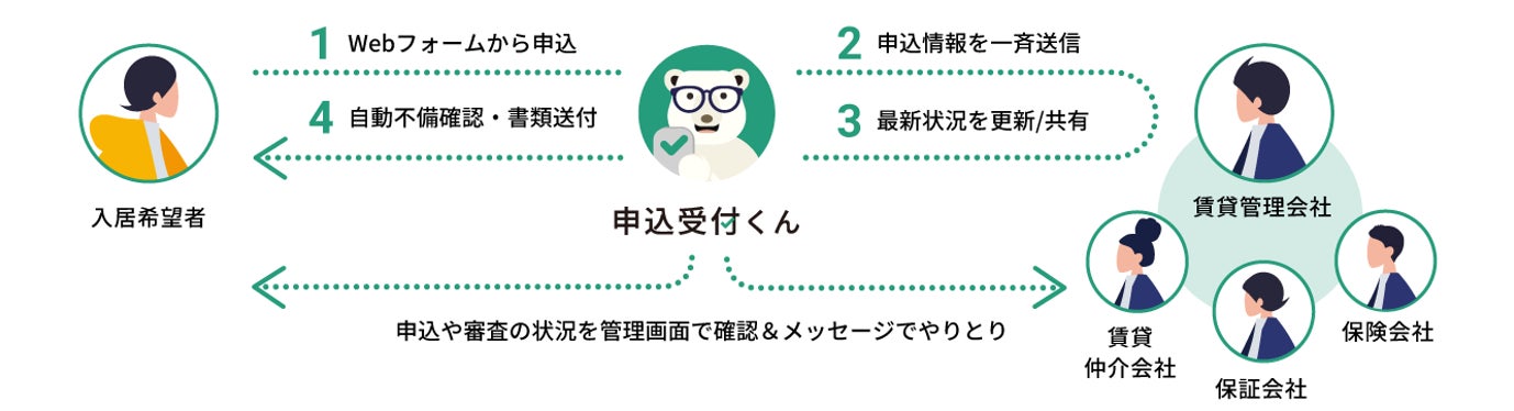 また、入居希望者がWeb上で入力した入居申込情報を仲介会社や家賃債務保証会社などに連携することで、申込手続きから審査までが簡素化されるなど、円滑な申込手続きを実現します。