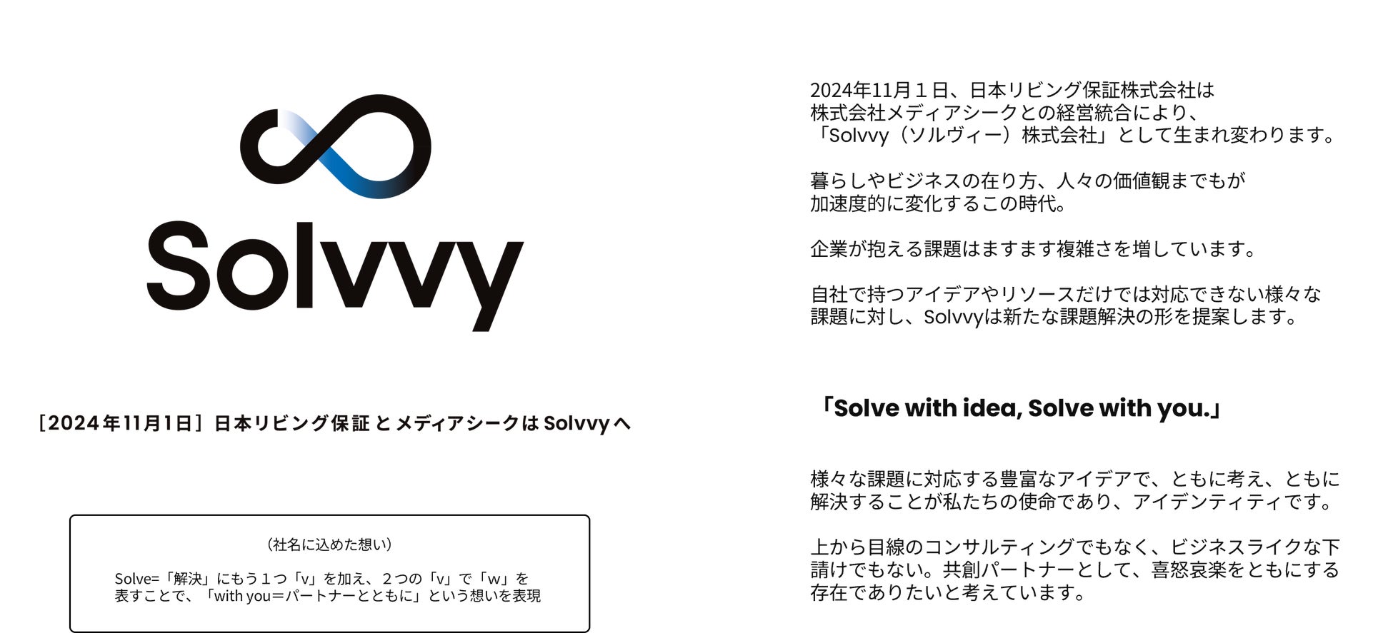 2024年11月1日、日本リビング保証株式会社は株式会社メディアシークとの経営統合に際し、「Solvvy(ソルヴィー)株式会社」として生まれ変わります。