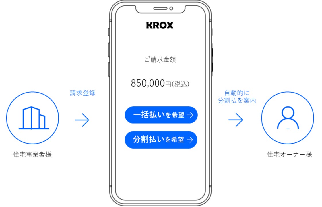 リフォーム代金請求のタイミングで「KROX」が自動的にお客様に分割払いを提案することで、リフォーム事業者様側の手間は最小限に、住宅リフォームを実施されるお客様に対して新たな支払手段の提供が可能となります。