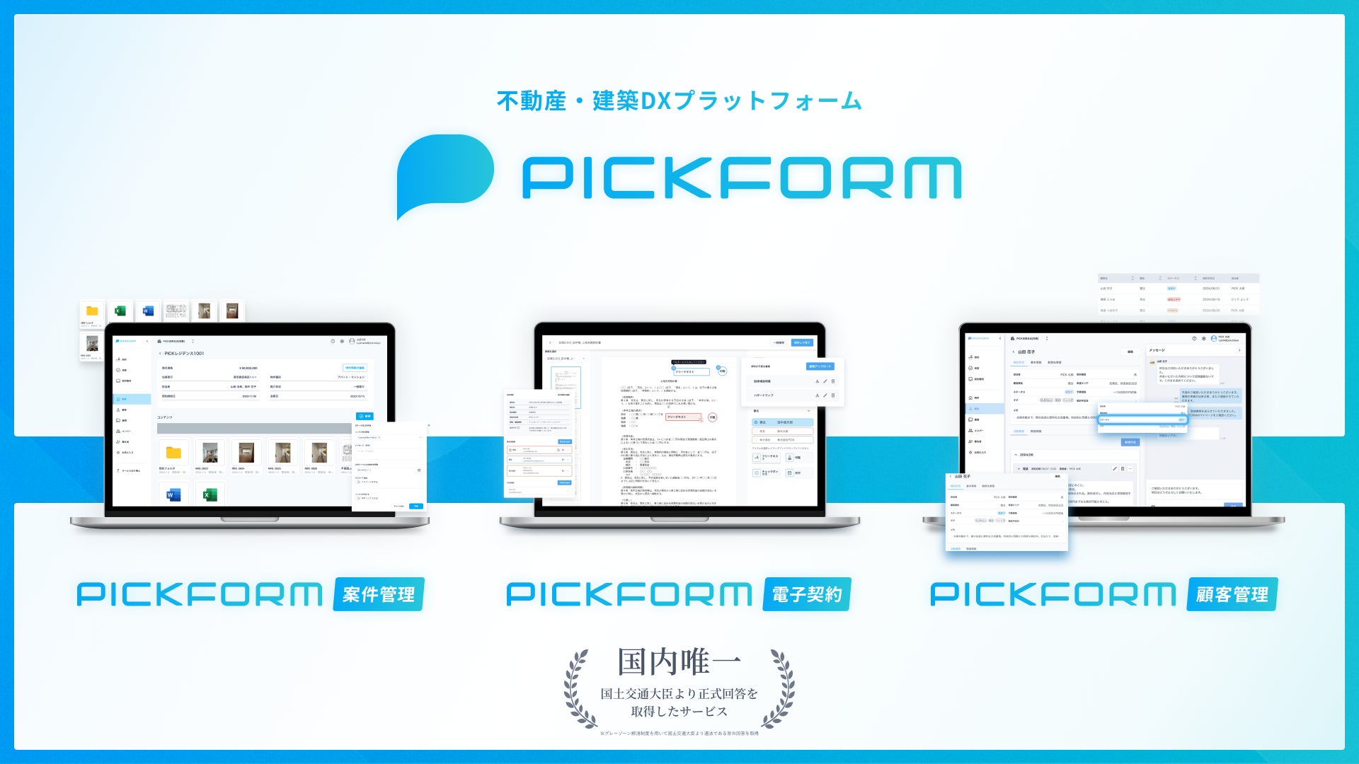 PICKが提供する「PICKOFORM」は国内で唯一、国土交通大臣から適法である正式な回答を得た、不動産取引に特化した電子契約機能を有しております。