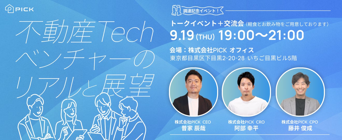 資金調達記念イベントとして、9/19(木)19時〜21時にPICKの目黒オフィスで交流会の場を設けられればと思っております。少しでも「PICKに興味がある方」などいらっしゃればお気軽にお越しください。