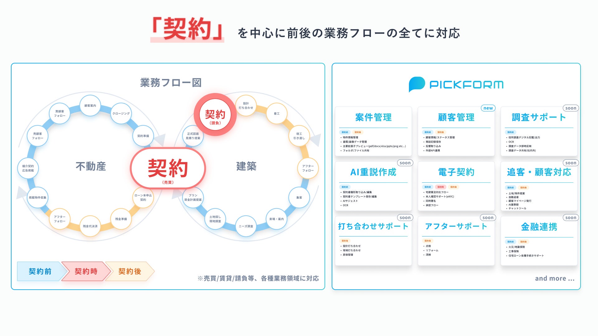 PICKは、不動産・建築の業務領域を「契約前」「契約時」「契約後」の3つに分類してプロダクト開発を行っております。