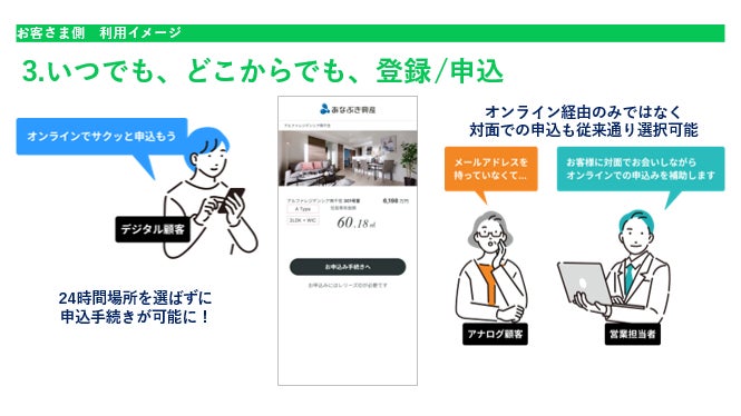 あなぶき興産におけるオンライン販売は、従来の対面販売を「置き換える」のではなく「拡張する」という考えに基づいています。対面での丁寧な接客やお客様との信頼関係の構築は引き続き最重要であると考えていますが、オンライン販売によりお客様が自身の状況に応じて、初期の情報収集から契約手続きまで、対面とオンラインを自由に組み合わせることができることで、その価値を補完し、お客さまの選択肢を広げることが目的です。