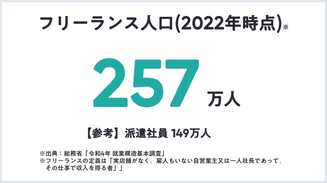 働き方の多様化やリモートでも仕事ができる環境づくりの促進などを背景として、総務省が初めて基幹統計として把握した2022年時点のフリーランス人口は257万4000人となり、派遣社員(149万人)を上回り、契約社員(283万人)に近い水準にまで、個人としての働き方が広がってきています。それを受けて、国としても多様な働き方のさらなる促進に向けて、個人が安心して働けるための法整備などを活発化させています。