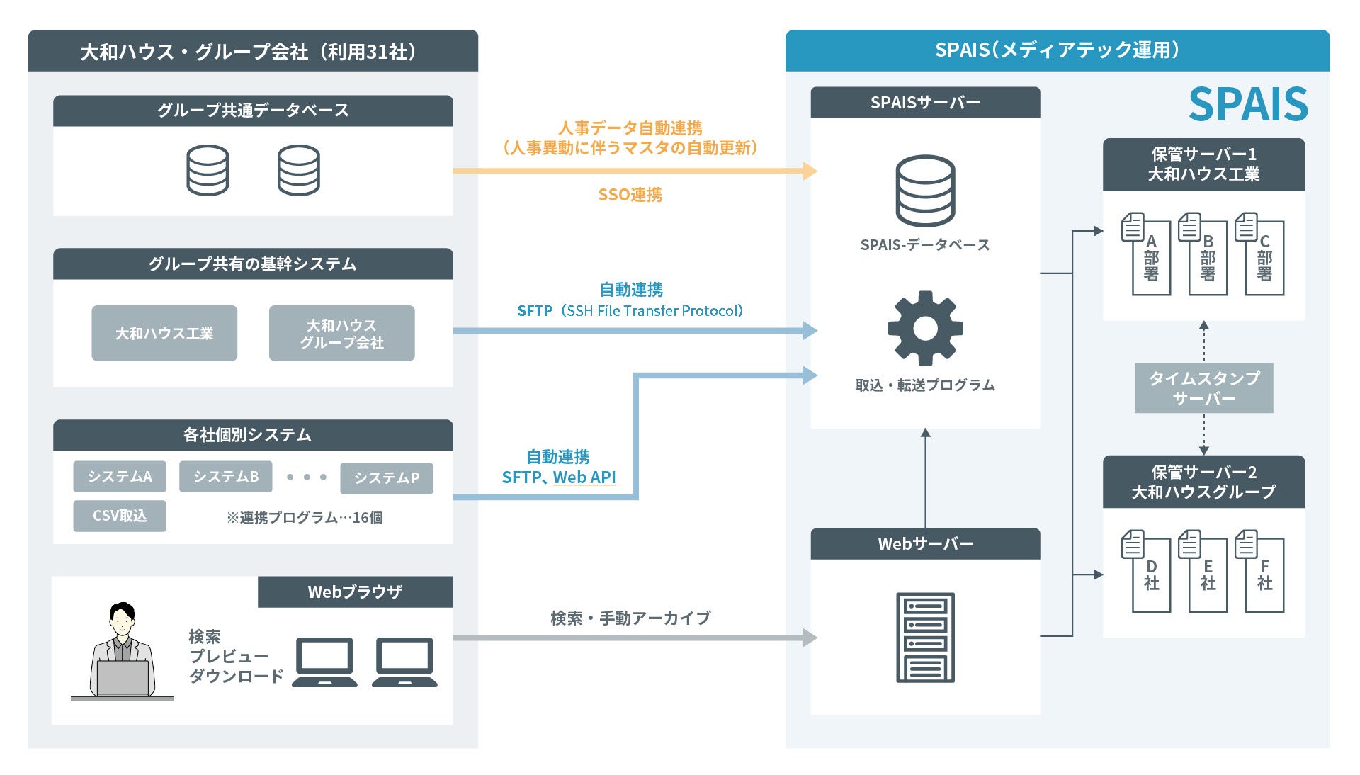 大和ハウス工業は、導入決定からわずか9ヶ月でSPAISを基盤とした電帳法対応を含むデジタル帳票基盤を構築し、2023年10月に本社およびグループ会社を含む31社で運用を開始しました。このデジタル帳票基盤には、グループ共通データベース、共有の基幹システム、各社の個別システムが自動連携され、経理データや契約書など約30種類の帳票データの自動連携と統合的な運用が実現しています。