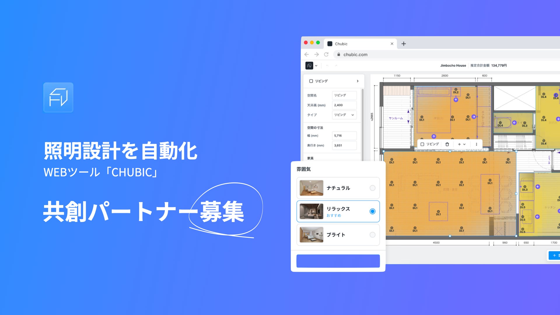 出典:PR TIMES,【募集】照明設計を自動化する「CHUBIC」共創パートナー募集,