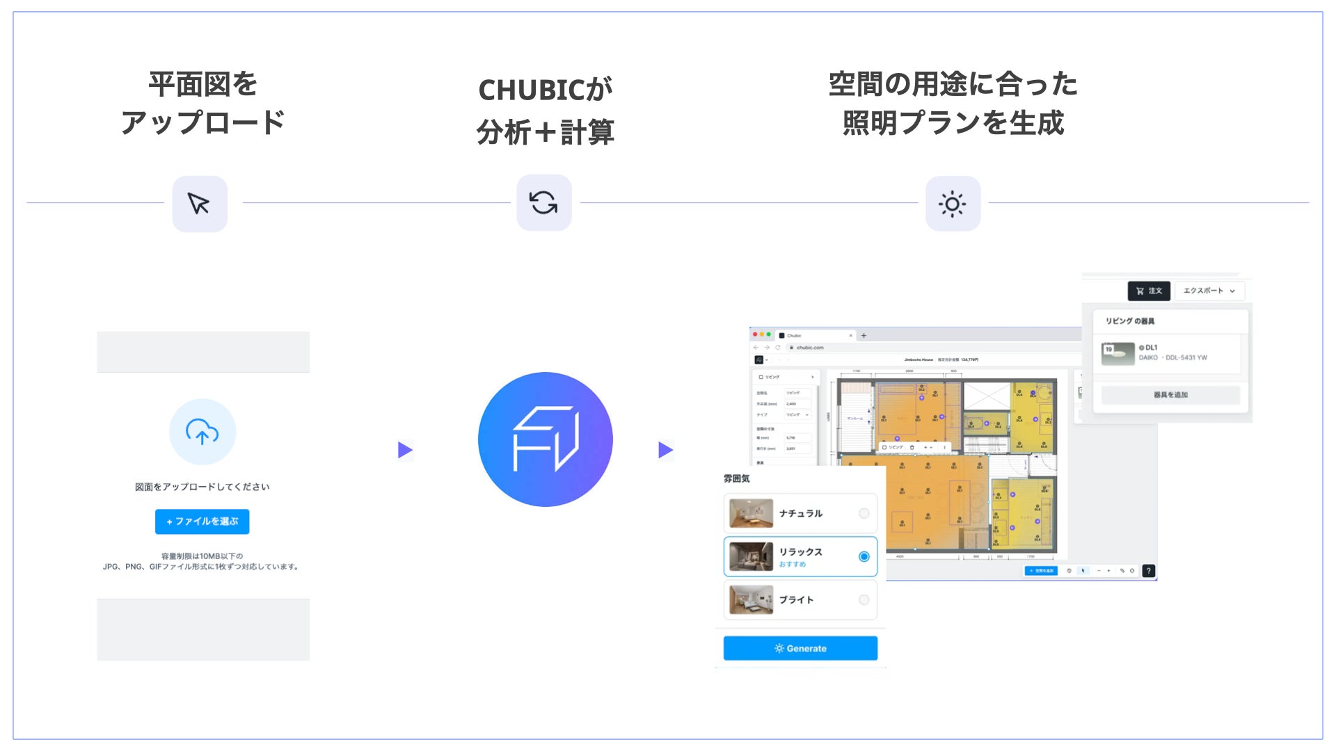 CHUBIC は、上質な照明プランを誰でも設計から発注まで数クリックでできる照明設計ツールです。平面図をアップロードし、条件を選ぶだけで、システムが最適な照明器具と配置図を提案します。高度な照明設計スキルは必要なく、ブラウザ上から無料で利用できます。
