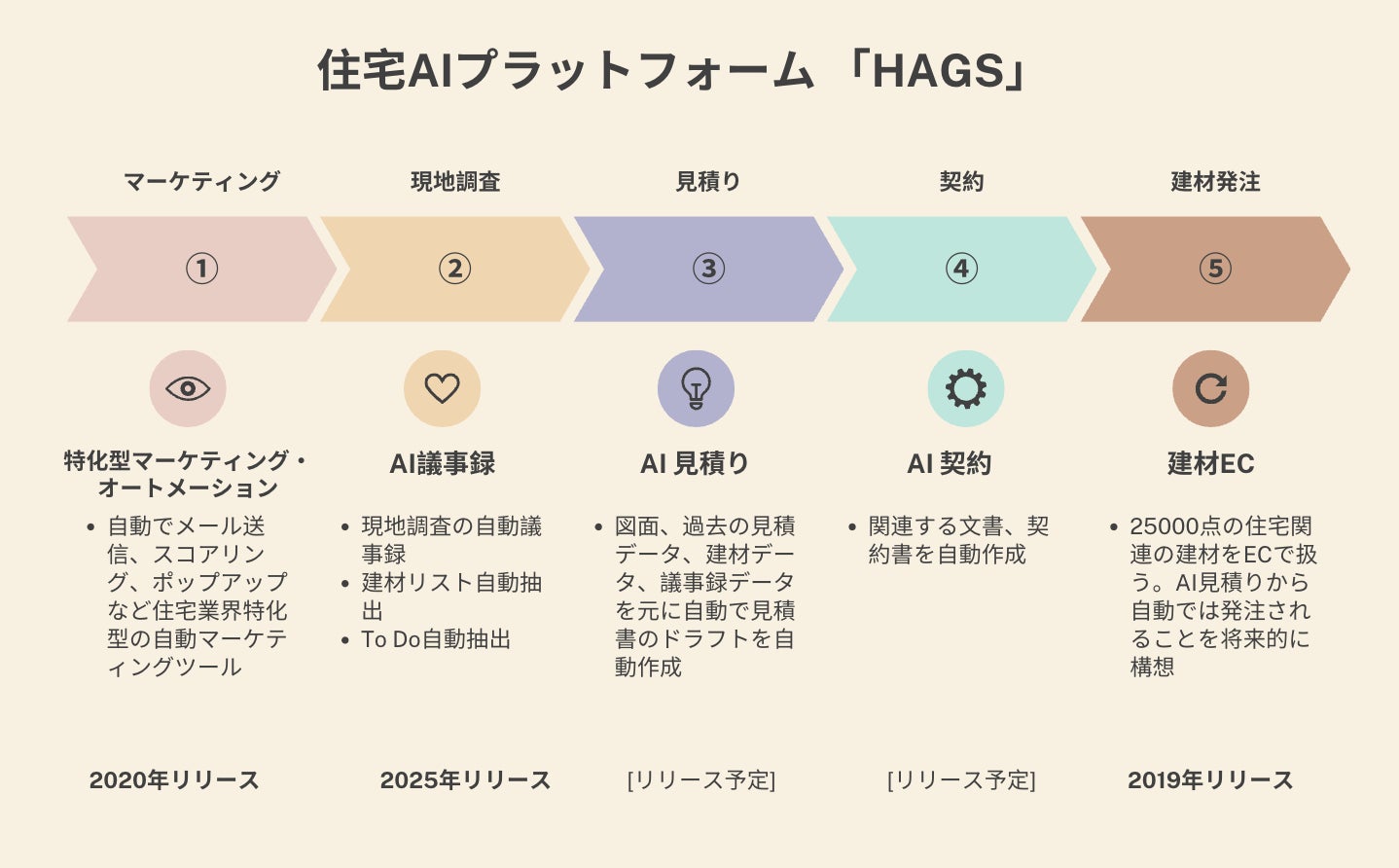 今回は、第一弾として建築業法で保存義務がある顧客との打ち合わせ内容を自動で要約し、必要な建材データ、To Doを抽出する「HAGS AI議事録」をリリースしました。今後弊社のCRM・MAである「Customer now!」に連携し、自動で見積書を作成する「HAGS AI見積り」、そこから半自動で建材EC「HAGS」で建材発注できる住宅AIプラットフォームを構築していきます。