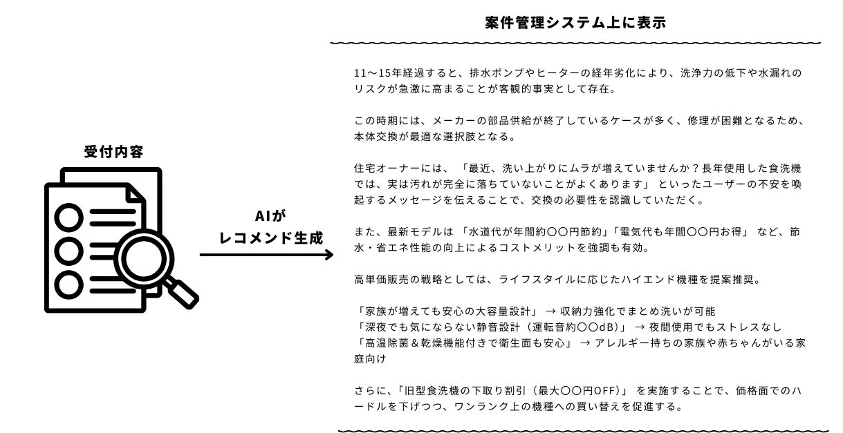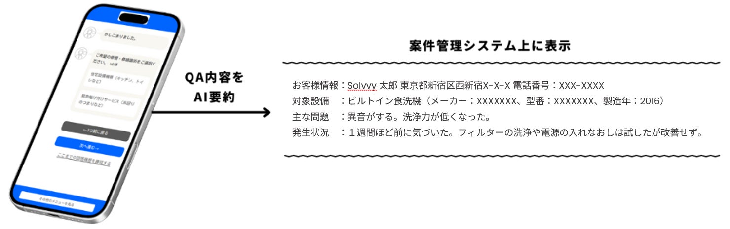また、登録された案件内容についてAIが要約を行い、案件管理システム上に即時表示されることで、アフター担当者は長文のQAを読むことなく対応すべき内容を把握できます。