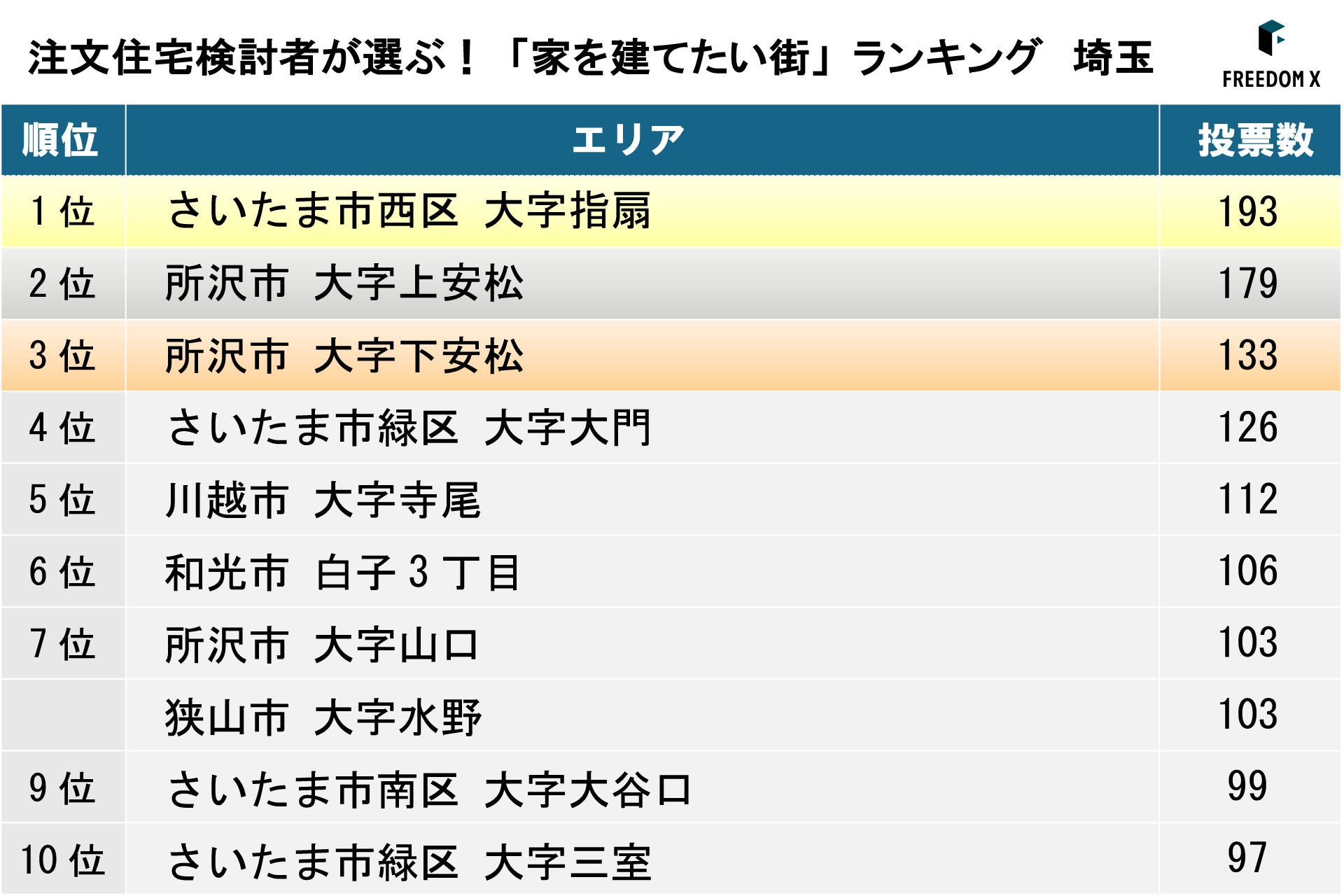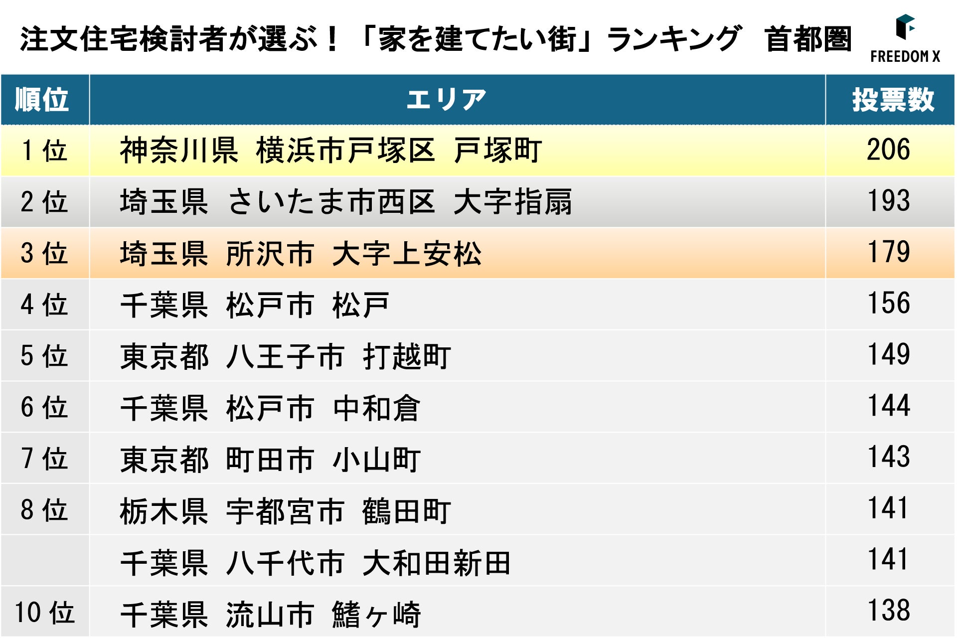 また、お気に入り登録者数が特に多かった東京都・神奈川県・千葉県・埼玉県においても、それぞれの「家を建てたい街ランキング」を個別に集計しています。