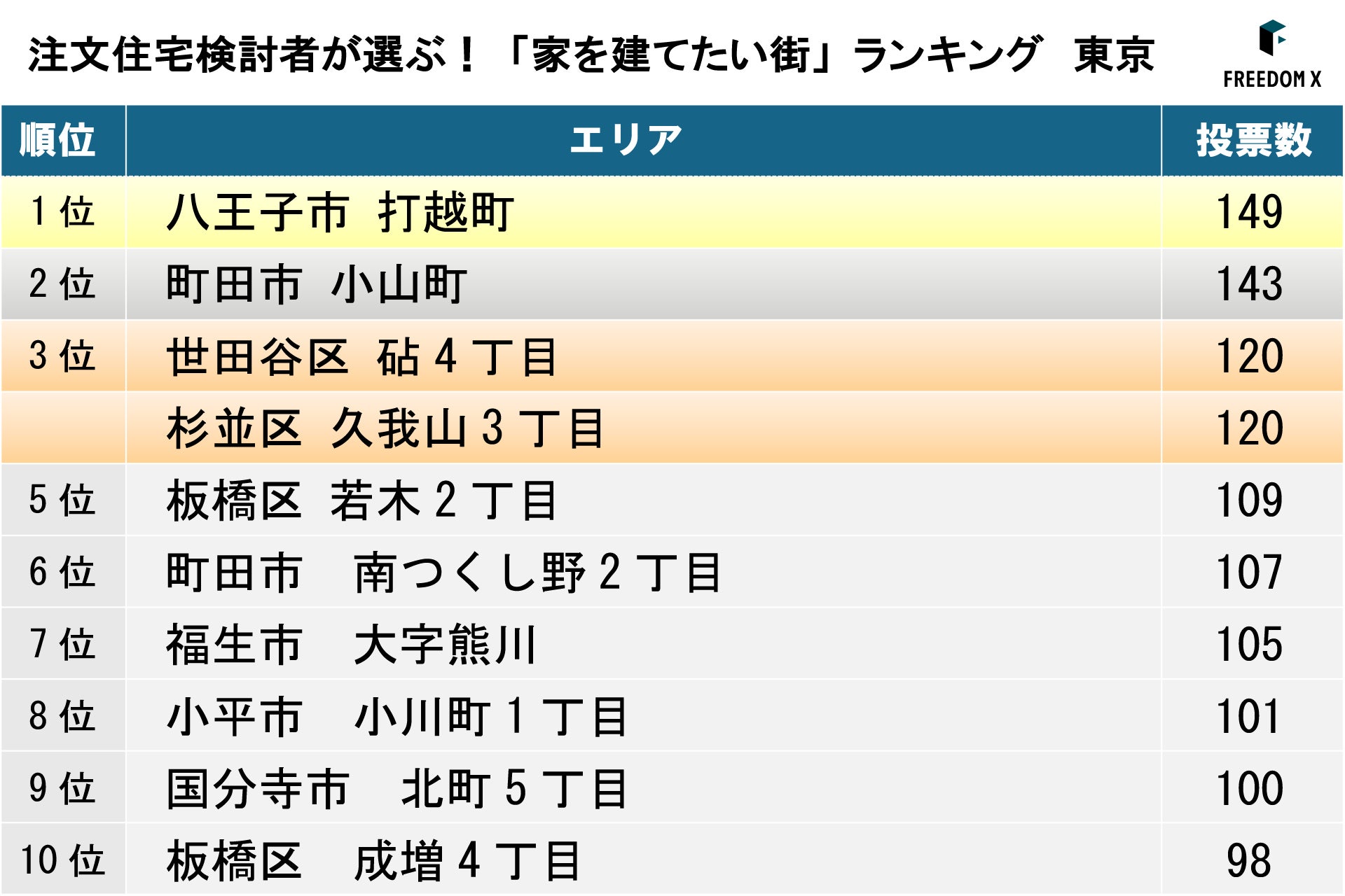 そのほかにも、広めの土地が比較的安価で手に入る「福生市」や「小平市」、都心アクセスとのバランスに優れた「板橋区 若木2丁目」、教育環境の良さが魅力の「杉並区 久我山」や「国分寺市」などもランキング上位に名を連ねました。