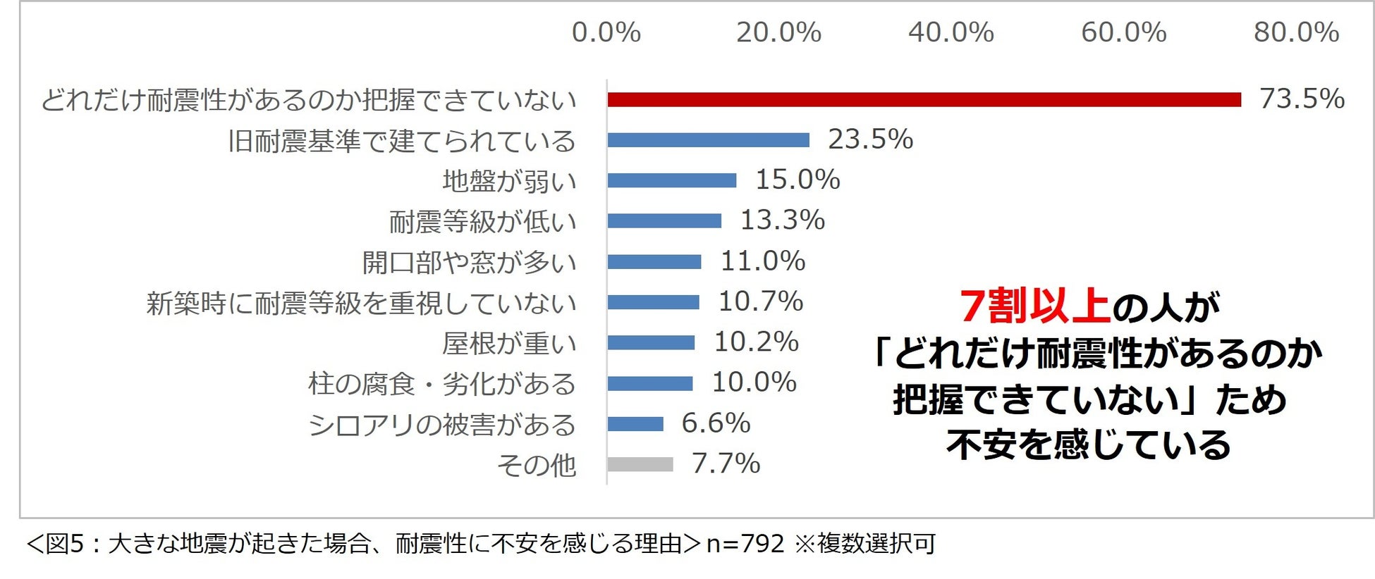 大きな地震が起きた場合、現在の自宅は安心できる耐震性を備えていないと思っている792名に、その理由について尋ねたところ、「どれだけ耐震性があるのか把握できていない」という回答が最も多く73.5%という結果になりました。(図5)