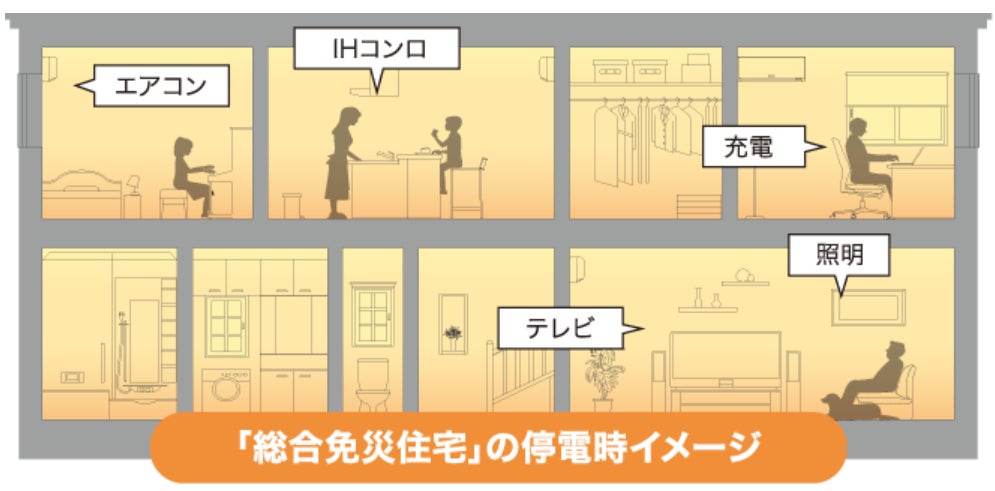 大容量太陽光パネルで創った電気を蓄電池に充電し、停電時も最大5.5kVAまで家中に供給。照明を点けたり、スマートフォンの充電などができるのはもちろん、小さなお子さまのいるご家庭でも、電気ケトルでミルクを作ったり、哺乳瓶を煮沸消毒したりと、ほぼ普段通り(※3)の生活を送ることができます。