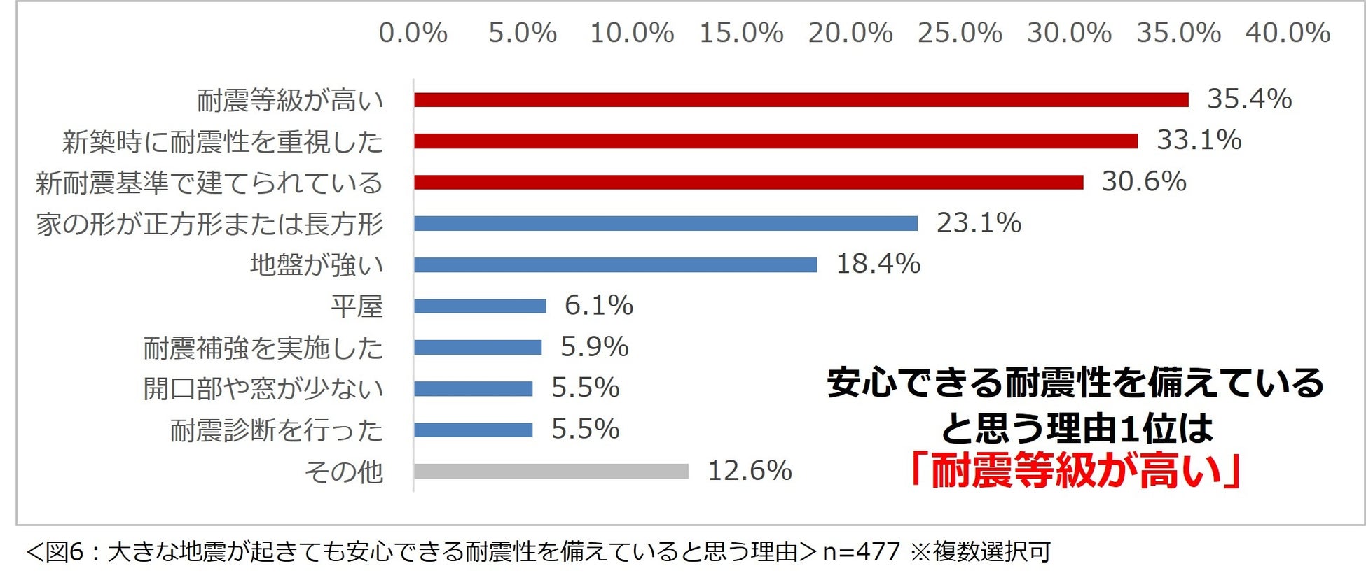 現在の自宅は、大きな地震が起きても安心できる耐震性を備えていると思っている477名に、その理由について尋ねたところ、1位「耐震等級が高い」(35.4%)、2位「新築時に耐震性を重視した」(33.1%)、3位「新耐震基準で建てられている」(30.6%)という結果になりました。(図6)