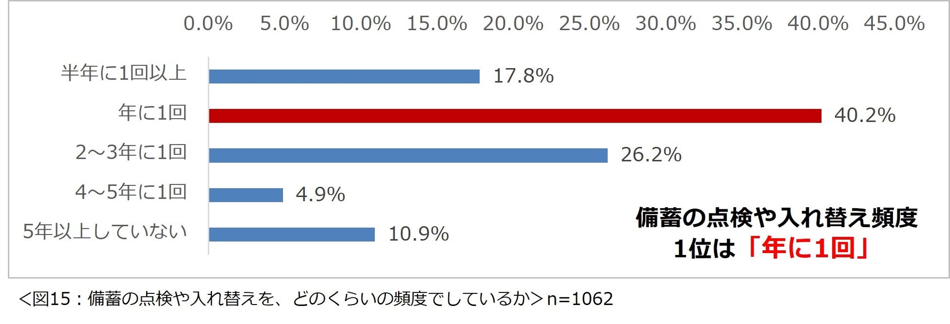 また、備蓄をしていると回答した1062名に、「備蓄の点検や入れ替えを、どのくらいの頻度でしていますか?」と尋ねたところ、「年に1回」と回答した人が最も多く40.2%という結果になりました。(図15)