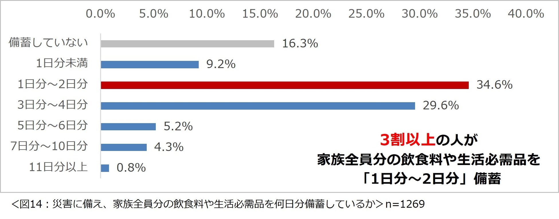 「災害でライフラインが停止した場合に備え、家族全員分の飲食料や生活必需品を何日分備蓄していますか?」と尋ねたところ、「1日分〜2日分」という回答が最も多く34.6%という結果に。また、16.3%の人は「備蓄していない」と回答しています。(図14)