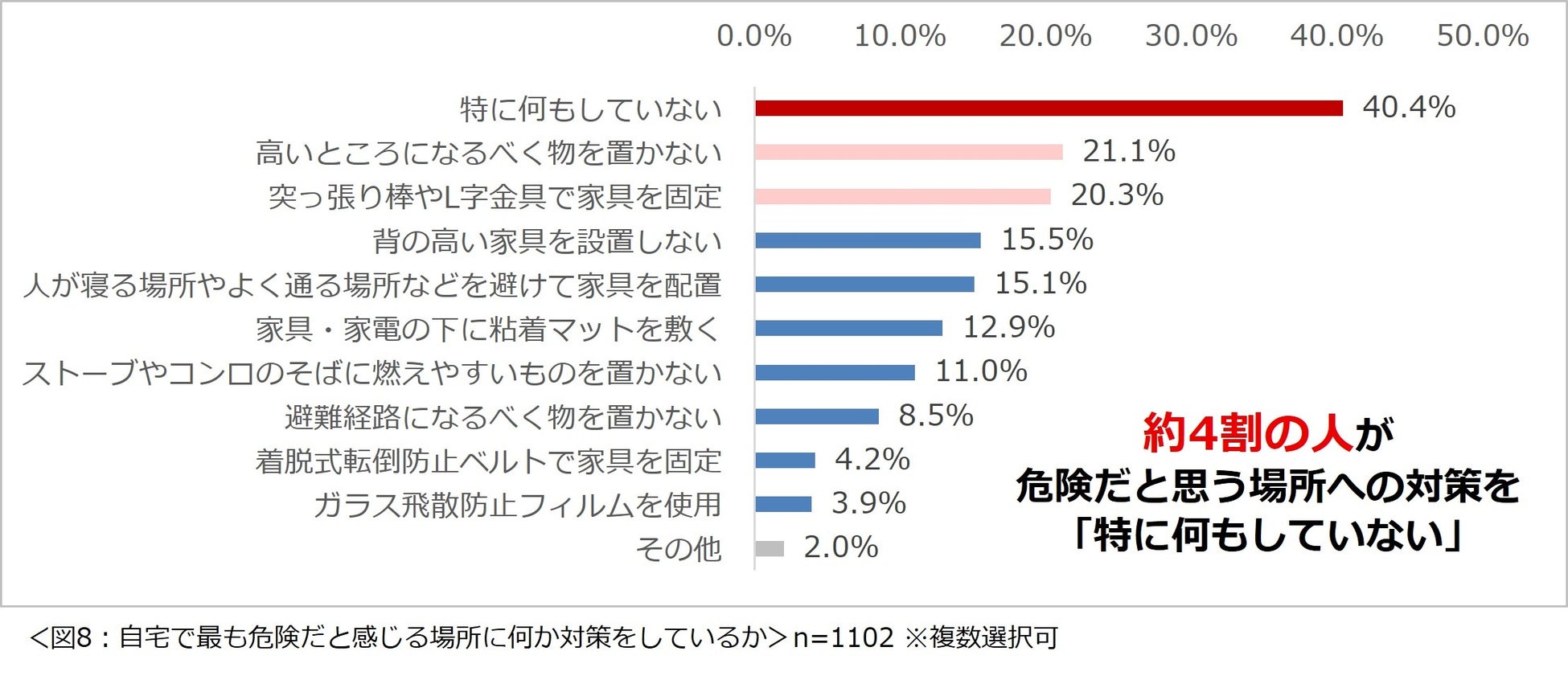 なお、危険だと感じる場所への対策方法について尋ねたところ、1位「高いところになるべく物を置かない」(21.1%)、2位「突っ張り棒やL字金具で家具を固定」(20.3%)と回答が続いた一方、何も対策をしていない人も約4割いました。(図8)