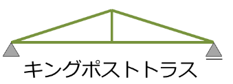 キングポストトラスは、中央に一本の縦材(キングポスト)を配し、左右の斜材と合わせてシンプルな三角形を構成する基本的な形状です。小規模なスパンに適しており、住宅の屋根などで多く用いられています。