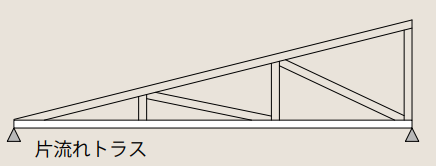 片流れトラスは、一方向に傾斜した屋根形状に対応するためのトラス構造です。片流れ屋根はシンプルでモダンな外観にぴったりで、住宅や小規模建築でよく採用されています。
