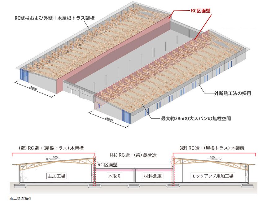 大林組は、グループ会社である内外テクノス本社工場の建て替えにあたり、木造・木質化推進の情報発信拠点となる大規模工場を建設しました。延べ8,000㎡を超える新工場は、壁・柱をRC造とし、屋根に最大28mの木造トラスを架構したハイブリッド構造が特徴です。