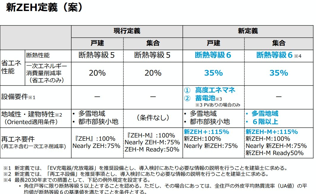 脱炭素社会を見据え、ZEH(ネット・ゼロ・エネルギー・ハウス)の定義が見直されます。具体的には2027年から導入予定の「新ZEH基準」では、断熱性能を現行の等級5から6以上へ、一次エネルギー消費量削減率を約35%へと引き上げる方向で検討が進んでいます。