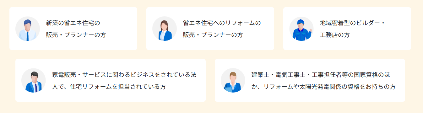 ZEHコーディネーター資格は、工務店やハウスメーカーの新築・リフォーム営業担当者だけでなく、家電販売業者、建築士、電気工事士など幅広い職種におすすめです。