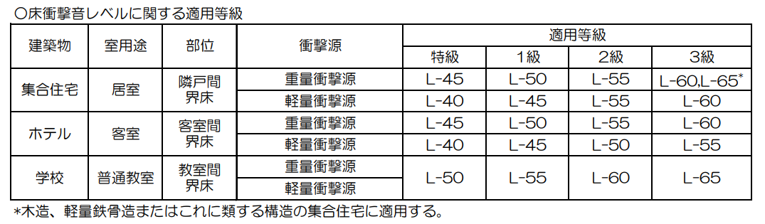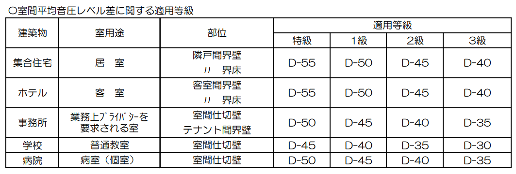 日本建築学会では、遮音性能を客観的に比較できるように基準を定めています。具体的な適用等級は、下表のレベルに分類されています。