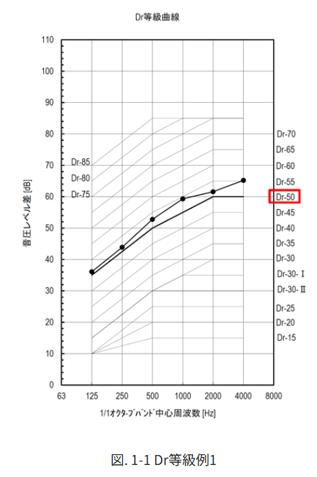 Dr値とは、空気伝搬音を、壁・天井・床・建具などの遮音性能を示す指標です。Dr値が大きいほど遮音性能は高く、例えば Dr-50レベルでは「日常生活で気兼ねなく生活できる」「隣戸をほとんど意識しない」といった程度の静音性が確保されます。