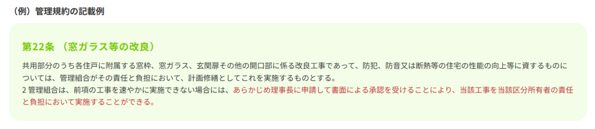 - 理事会において要望を可決し、管理規約等を改訂(外窓等の共用部の戸別改修が可能になる)
