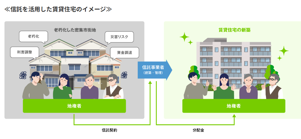 しかし不動産信託を活用すると、複数の土地や建物を信託財産としてまとめて運用し、受託者が主導して再開発・建替え計画を進められるようになります。所有者は受益権という形で利益を受けつつ、安全性向上や防災機能強化など地域改善に寄与できます。区画整理や共同化が促進され、行政施策とも連携しやすい点もメリットです。
