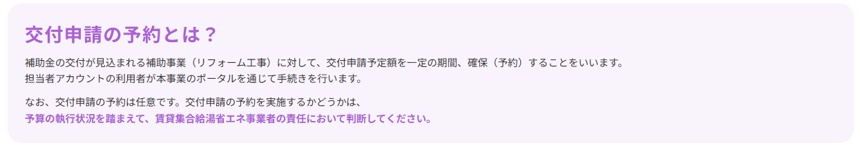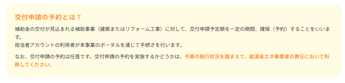 給湯省エネ2025事業では、補助金の交付が見込まれる補助事業(建築またはリフォーム工事)に対して、交付申請予定額を一定の期間、確保(予約)可能です。なお、交付申請の予約は任意です。