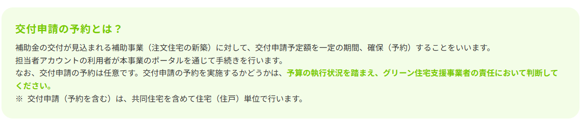 子育てグリーン住宅支援事業では、交付申請の予約が可能です。これは補助金の交付が見込まれる補助事業(注文住宅の新築)に対して、交付申請予定額を一定の期間、確保(予約)できる制度です。